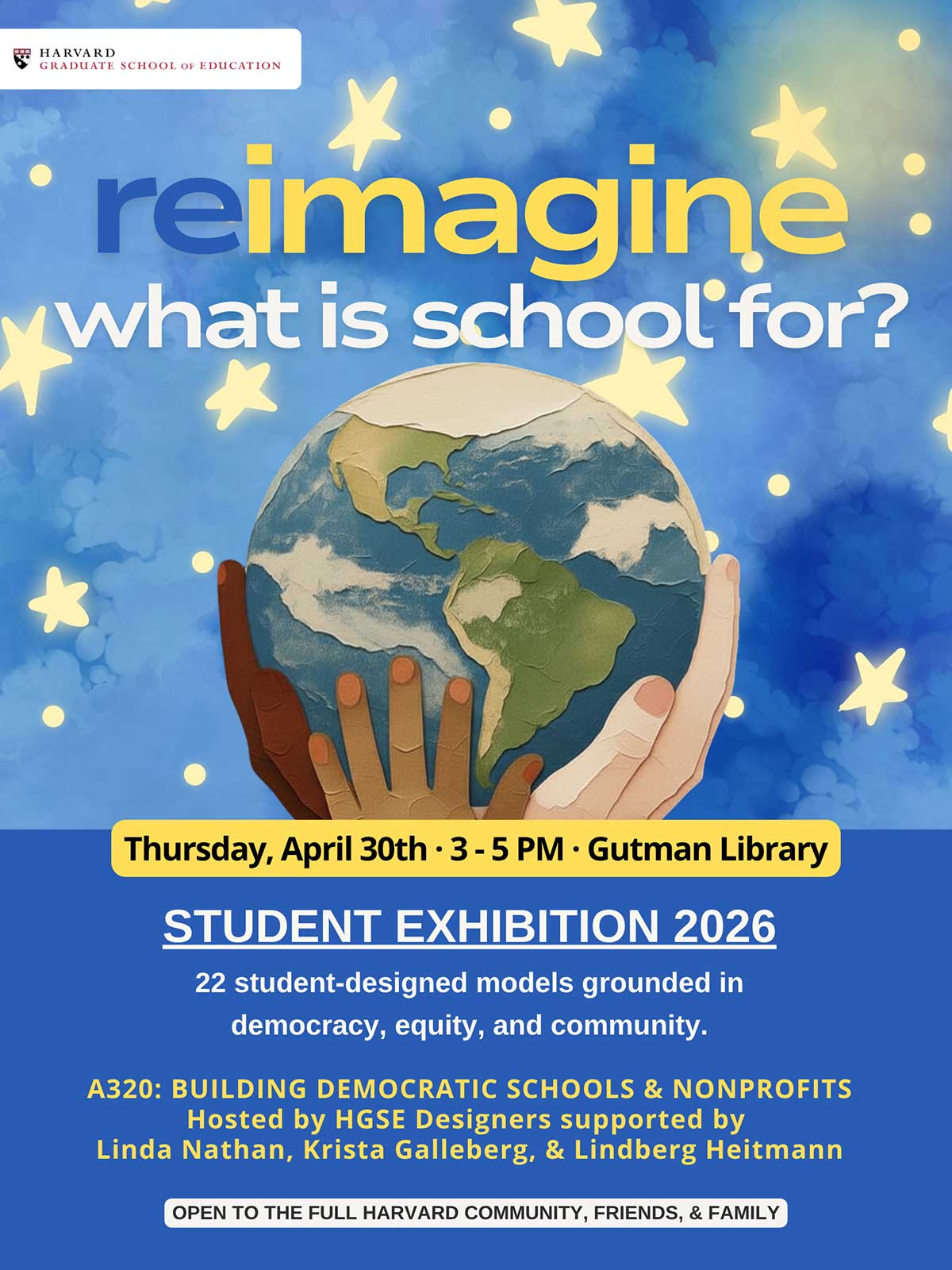 Now, some of these same HGSE students (plus many more) will have an opportunity to exhibit their own ideas in a powerful exhibition of learning. My students, who come from around the globe, have designed schools and nonprofits that truly give me hope for a better world. Their designs will give the next generation of young people a chance to practice the pillars of democratic education: Democratic Practices Matter!